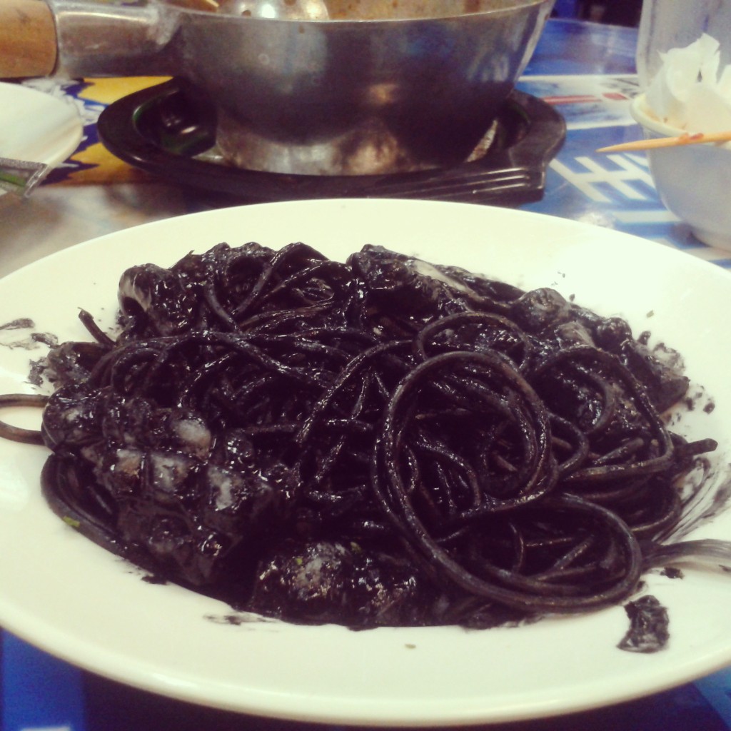 We scooped the pasta it onto our plates and watched as the ink stained everything it touched. The noodles left black trails; the serving bowl slowly became a large ink blot. We slurped the pasta from our chopsticks, laughing as we watched each other’s mouths turn black. Our teeth and lips and tongues were covered in ink.